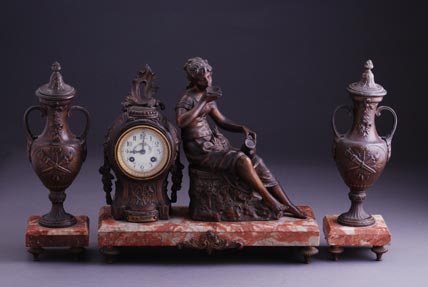 Mermer i bronza. Sa figurom devojke sa ibrikom i natpisom ”A la Fontaine”, vajara Ruffony-a. Francuska, kraj 19. veka. Dimenzije sata: 31 x 40 x 14 cm, visina urni: 36 cm