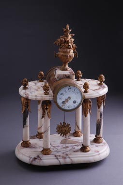 Francuska, polovina 19. veka. Šest stubića belog mermera i bronza. Otkucava na pola i pune sate. Dimenzije: 52 x 35 x 20 cm