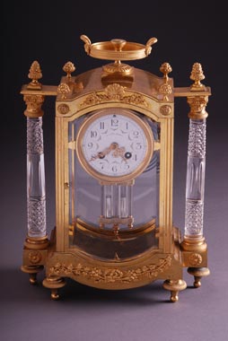 Francuska, polovina 19. veka Pozlaćena bronza. Na vrhu antička posuda sa ručkama. Bočni kristalni, valjkasti stubići sa korintskim kapitelima od bronze. Šlifovano staklo na sve četiri strane. Klatno sa živom. Porcelanski brojčanik. Otkucava na pola i pune sate. Radionica: Leon Delaplace, Caen. Dimenzije: 36 x 26 x 14 cm