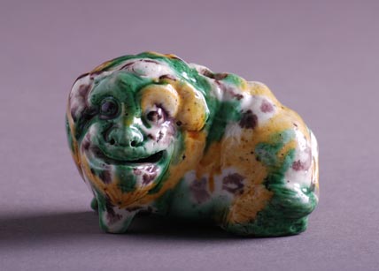 Kina, Qing dinastija. Kangxi (1662-1722). Apstraktna predstava mitske zivotinje u ležećem položaju, sa malim okruglim otvorom na ledjima. Oslikana razlivenim bojama. Dužina 9 cm.
