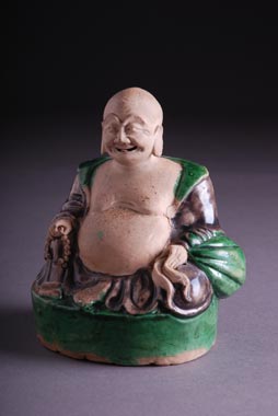 Kina, Qing dinastija. Kangxi (1662-1722). Na ovalnom postolju, sedeći bog sreće u dugoj zelenoj i smedjoj odori. Lice i stomak su neglazirani. Visina 14 cm.