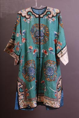 Bogato izvezen svilom u boji i zlatnim nitima. Predstave cvetova hrizantema, riba, urni u stilizovanim krugovima. Po ivici prikazani karakteristični pejzaži Japana. Japan, 19. vek. Dužina: 105 cm, širina: 127 cm