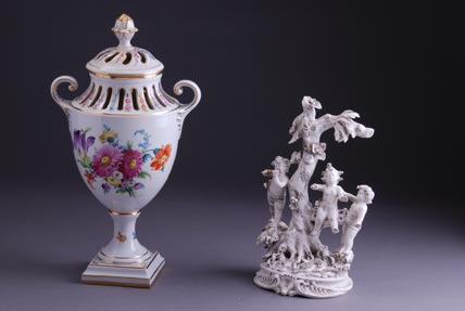 Rukom oslikama cvetnim motivima i pozlatom sa poklopcem. Kraj 19. veka. Dresden, Nemačka. Visina 42 cm.
