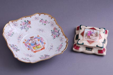 Ručno oslikana plemićkim grbom i cvetnim vencima, sa belim emailiranim ornamentima i obodom u pozlati. ”Ulim” (Union Limousine), Limoges, Francuska. Dimenzije 22 x 22 cm