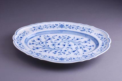 Oslikan plavom floralnom i folijažnom ornamentikom. Žigovi: utisnuti,”Carl Knoll Carlsbad” i plavi podglazurni ”Carl Knoll Patent, Fischern”. Rybare, Bohemia, 1848. godina. Dimenzije: 46 x 35 cm