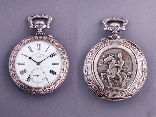Doxa, Švajcarska, oko 1910. godine. Dva poklopca. Brojčanik sa Rimskim brojevima, na poleđini reljefno iskazan jahač na konju u skoku preko prepona uokviren potkovicom. Prečnik 70 mm