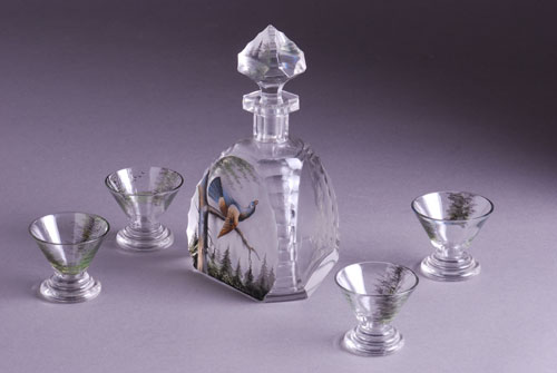 Art Deco stil. Bohemia, oko 1920. godine. Na flakonu emajlom oslikan tetreb na grani četinara u ljubavnom zovu. 4 čašice oslikane pticama u letu i četinarima. Visina flakona sa poklopcem 22 cm