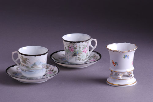 Ručno oslikane dalekoistočni motivi sa paunima, hrizantemama i Fudžijamom u pozadini. Na poleđini tanjirića potpis autora (Farsi?)Visina šolje 6,5 cm, prečnik tacnice 12,5 cm (4 kom)