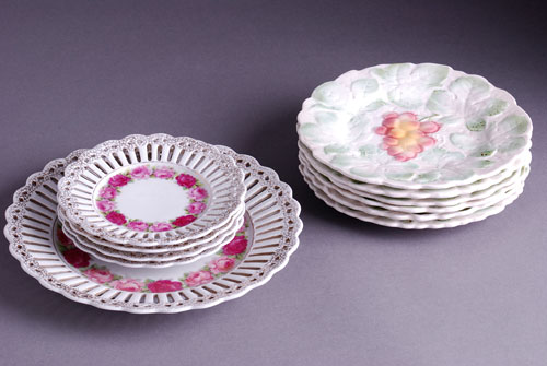 Schumann, Bavaria, Nemačka. Između dva rata.Veliki tanjir (prečnik 24cm) i 4 tanjirića (prečnik 15cm) oslikani ružama i sa pozlatom po obodu. (5 kom)