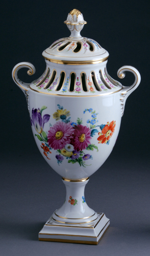 Dresden, Nemačka. Kraj XIX veka. Rukom oslikama cvetnim motivima i pozlatom sa poklopcem. Visina: 42 cm.