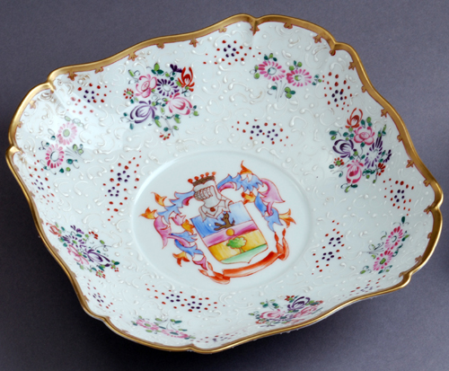 Francuska, Ulim (Union Limousine), Limoges. Ručno oslikana plemićkim grbom i cvetnim vencima, sa belim emailiranim ornamentima i obodom u pozlati. Dimenzije: 22 x 22 cm.