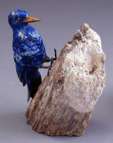 Figura postavljena na postolje od okamenjenog drveta. Dimenzije: 19 x 15 cm.