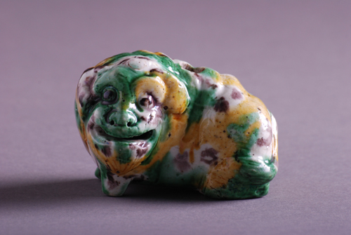Kina, Qing dinastija. Kangxi (1662-1722). Apstraktna predstava mitske životinje u ležećem položaju, sa malim okruglim otvorom na leđima. Oslikana razlivenim bojama. Dužina: 9 cm.