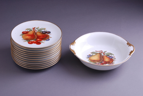 Čehoslovačka, između dva rata. Žig trgovine iz Holandije: Hag, Amsterdan, Utreht. Duboka činija i 12 tanjira oslikana različitim voćem. Prečnik činije: 26 cm, prečnik tanjira: 20 cm. (13 kom)