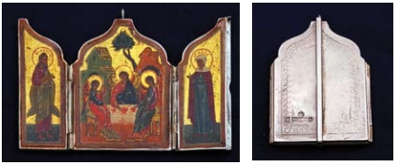 Sveta Trojica (Gostoljublje Avramovo), tempera na dasci. Moskva, kraj XIX veka. Izuzetan rad čuvene radionice Ivana Hlebnikova. Žigovi carske Rusije, grada Moskve i finoće 84. Dimenzije: 8 x 11 cm.