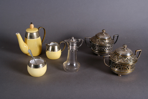Tri dela (kafetijera, posuda za mleko i šećer). Porcelan i srebro. Visine: 15, 6 i 5, 5 cm.