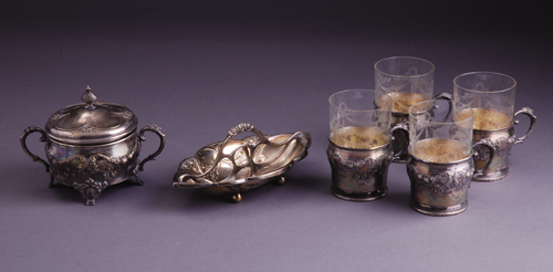 Beč, Austrija, oko 1900. Žig: Argentor, ASI.G. Činije za slatko i kašičice, 4 staklene čaše u držačima. Visina činije za slatko: 13 cm. (6 kom)