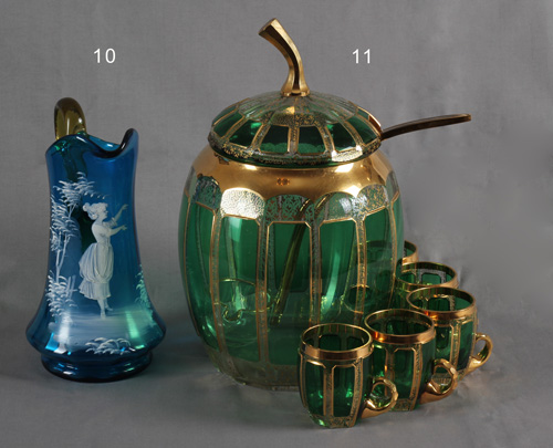 Smaragdne boje sa pozlatom Češka. Činija sa poklopcem, kutlača i 12 čaša sa drškom. Visina činije: 34 cm.