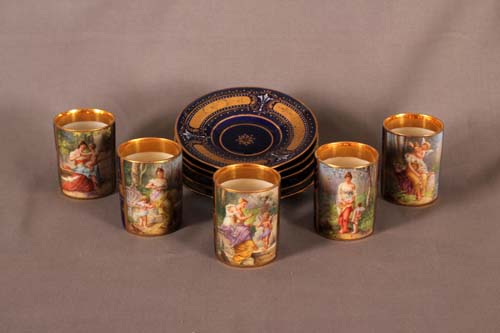 Austrija. Žig starog Beča (košnica). Oslikane pastoralnim scenama. Visina šoljice: 5 cm, prečnik tanjirića: 10 cm.