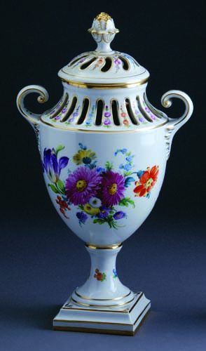 Dresden, Nemačka. Kraj XIX veka. Rukom oslikama cvetnim motivima i pozlatom sa poklopcem. Visina: 42 cm.