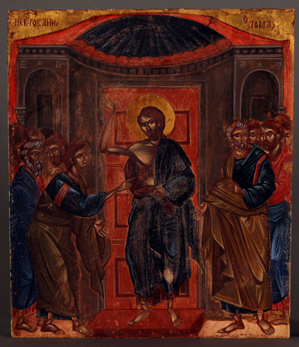 Levantski barok (Grčka-Makedonija). Ulje na dasci, prva polovina XVIII veka. Dimenzije: 35 x 26 cm. (ošt. plamenom kandila)