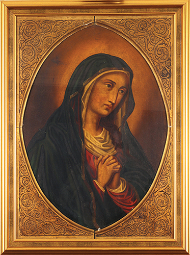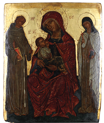 Kraj XVIII veka. Dalmacija. Ulje i pozlata na dasci, 51x42 cm Sinkretistička ikona (zastupljene dve konfesije: Pravoslavna i Katolička). Pored Bogorodice se nalaze Sv. Franja i katolička svetiteljka.