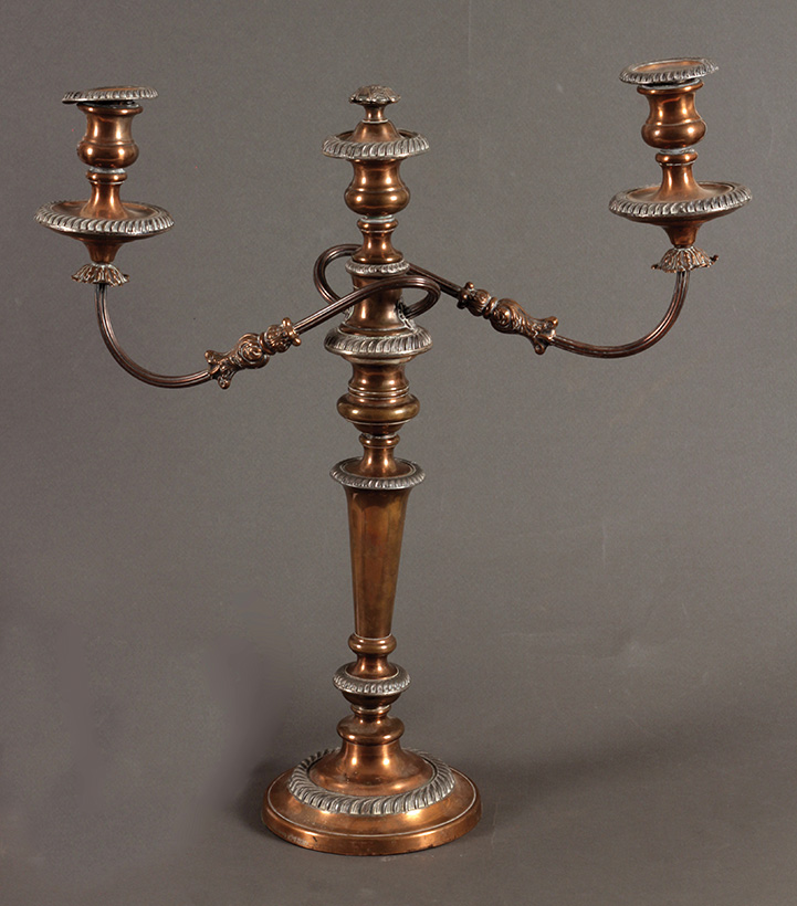 Oko 1900. Mesing i porcelan. Visina sata: 39 cm, visina svećnjaka: 34 cm.