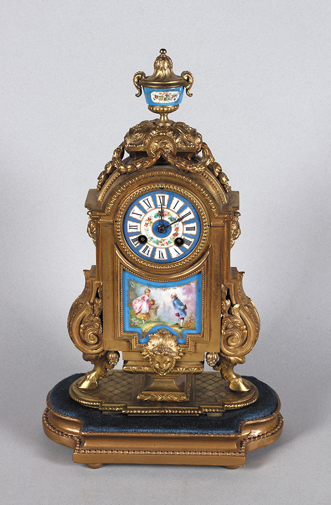 Francuska, oko 1880. Bronza, galantna scena i ciferblat na porcelanu. Visina: 45 cm