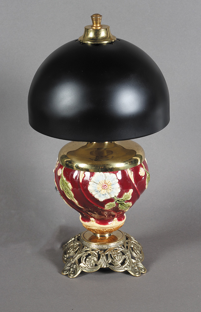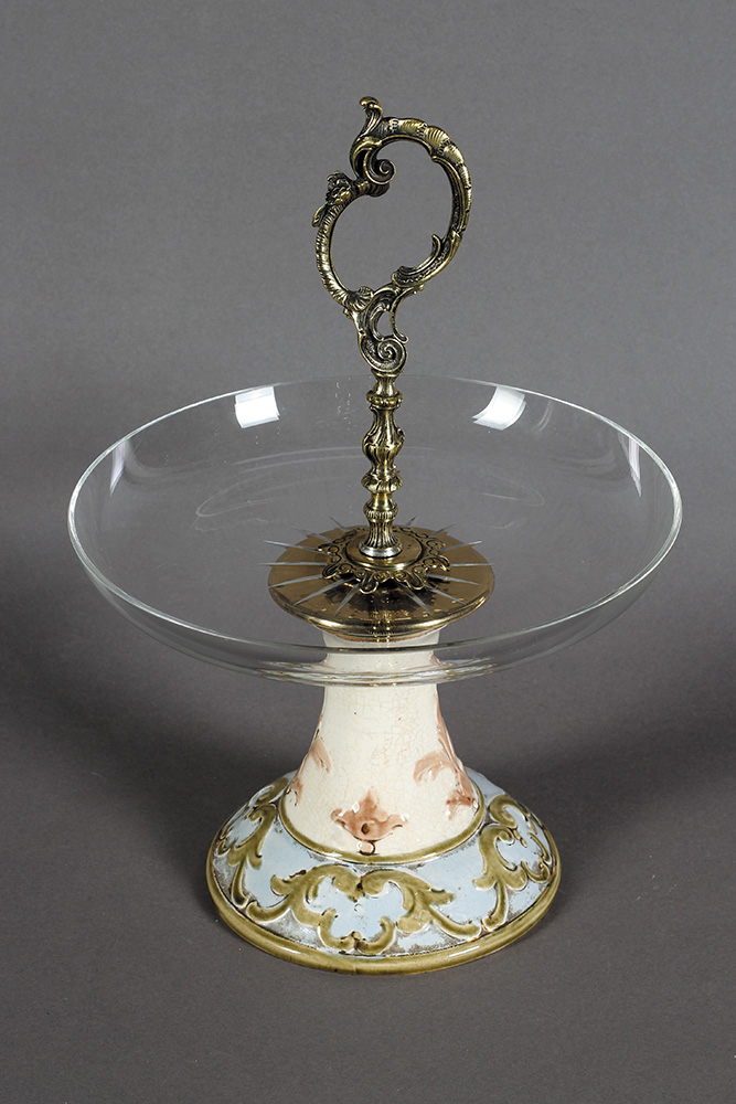 Majolika, brušeno staklo, mesing. Visina: 37 cm