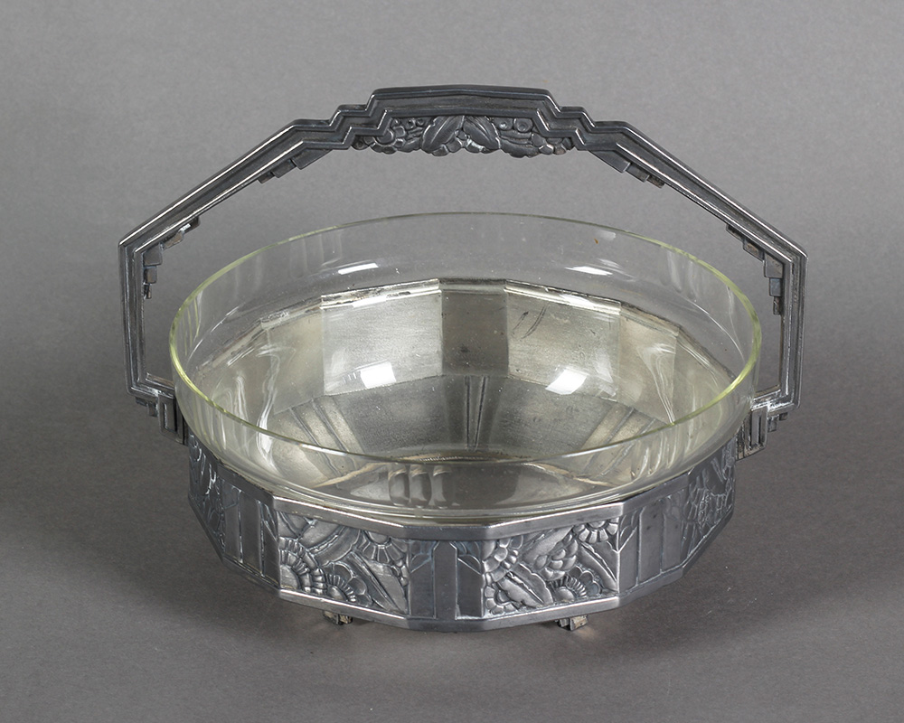 Posrebreni cin, brušeno staklo. Dimenzije: 24,5x20 cm